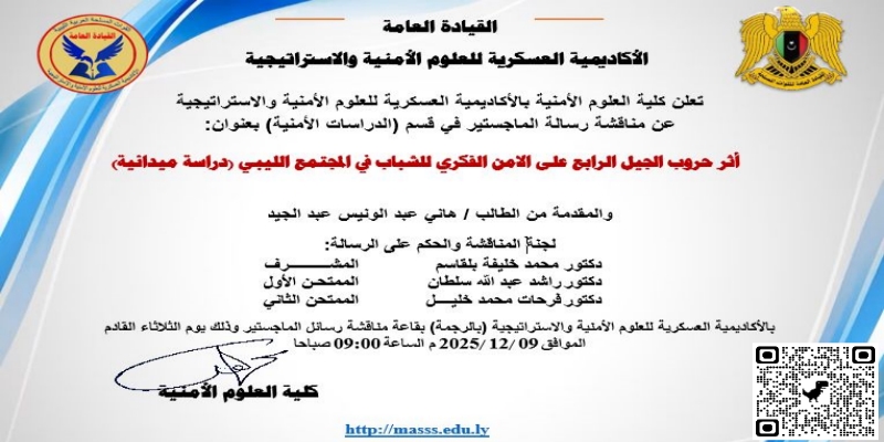 مناقشة رسالة ماجستير بعنوان أثر حروب الجيل الرابع على الامن الفكري للشباب في المجتمع الليبي