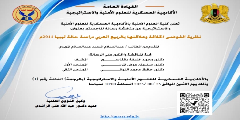 مناقشة رسالة ماجستير بعنوان نظرية الفوضى الخلاقة وعلاقتها بالربيع العربي دراسة حالة ليبيا 2011م