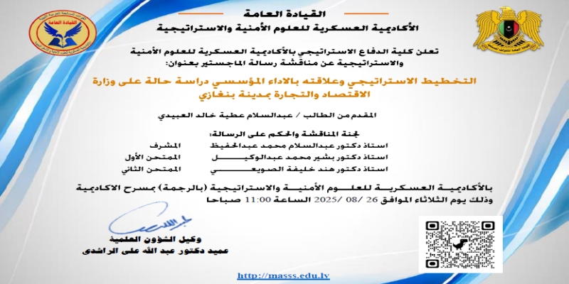 تعلن كلية الدفاع الاستراتيجي بالأكاديمية العسكرية للعلوم الأمنية والاستراتيجية عن مناقشة رسالة الماجستير في قسم (الدراسات الاستراتيجية) بعنوان: