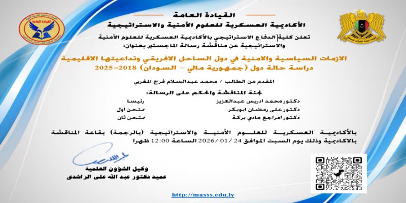 تعلن كلية العلوم الامنية بالأكاديمية العسكرية للعلوم الأمنية والاستراتيجية عن مناقشة رسالة الماجستير في قسم (العلوم الامنية) بعنوان: