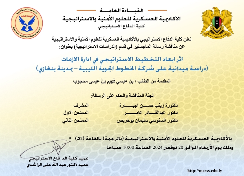 تعلن كلية الدفاع الاستراتيجي بالأكاديمية العسكرية للعلوم الأمنية والاستراتيجية عن مناقشة رسالة الماجستير في قسم (الدراسات الاستراتيجية) بعنوان:
