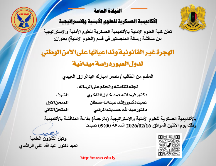 تعلن كلية العلوم الامنية بالأكاديمية العسكرية للعلوم الأمنية والاستراتيجية عن مناقشة رسالة الماجستير في قسم (العلوم الامنية) بعنوان: