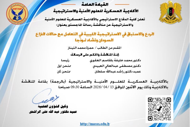 تعلن كلية الدفاع الاستراتيجي بالأكاديمية العسكرية للعلوم الأمنية والاستراتيجية عن مناقشة رسالة الماجستير في قسم (الدفاع الاستراتيجي) بعنوان:
