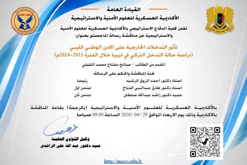 تعلن كلية الدفاع الاستراتيجي بالأكاديمية العسكرية للعلوم الأمنية والاستراتيجية عن مناقشة رسالة الماجستير في قسم (الدراسات الاستراتيجية) بعنوان: